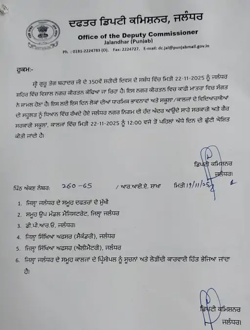 जालंधर में कल यानि शनिवार 22 नवंबर को को सभी सरकारी और गैर सरकारी स्कूलों में आधे दिन की छुट्टी (दोपहर 12 बजे से पहले) रहेगी। श्री गुरु तेग बहादुर के 350वें शहीदी दिवस को लेकर डीसी जालंधर डॉक्टर हिमांशु अग्रवाल ने ये आदेश जारी किया है। पढ़ें आदेश की कॉपी