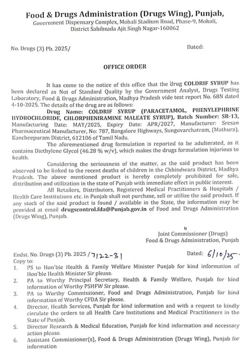 मीडिया सवेरा (न्यूज़ डेस्क): MP में कोल्ड्रिफ कफ सिरप से 17 बच्चों की मौत के बाद पंजाब सरकार ने इस सिरप की बिक्री और उपयोग पर पूरी तरह से रोक लगा दी है। तमिलनाडु में बनी इस दवा में डायथिलीन ग्लाइकॉल की मिलावट पाए जाने के चलते यह निर्णय लिया गया। पंजाब के स्वास्थ्य विभाग ने सभी खुदरा वि