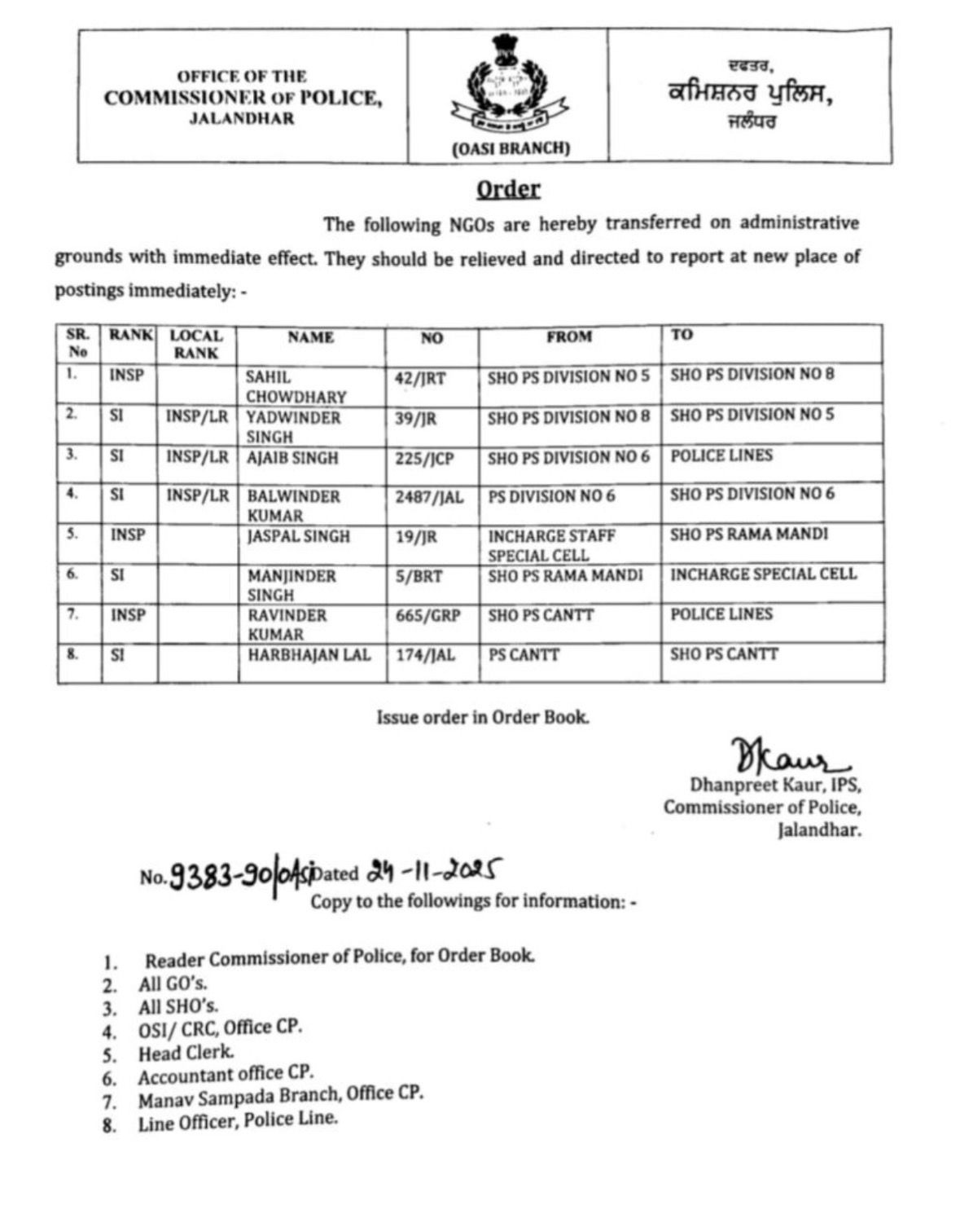 जालंधर पुलिस कमिश्नर ने सोमवार को कई थानों के इंस्पेक्टरों का तबादला करते हुए बड़े प्रशासनिक बदलाव किए हैं। आदेश जारी करते हुए कमिश्नर ने दो इंस्पेक्टरों को तुरंत प्रभाव से पुलिस लाइन हाज़िर करने के निर्देश दिए हैं। जिन अधिकारियों को लाइन हाज़िर किया गया है, उनमें थाना नंबर 6 के प्रभारी इंस्पेक्टर अजैब सिंह और जालंधर कैंट के प्रभारी इंस्पेक्टर रविंद्र कुमार शामिल हैं। इसके साथ ही अन्य कई थानों में नए प्रभारी नियुक्त किए गए हैं। पूरी सूची नीचे जारी—👇